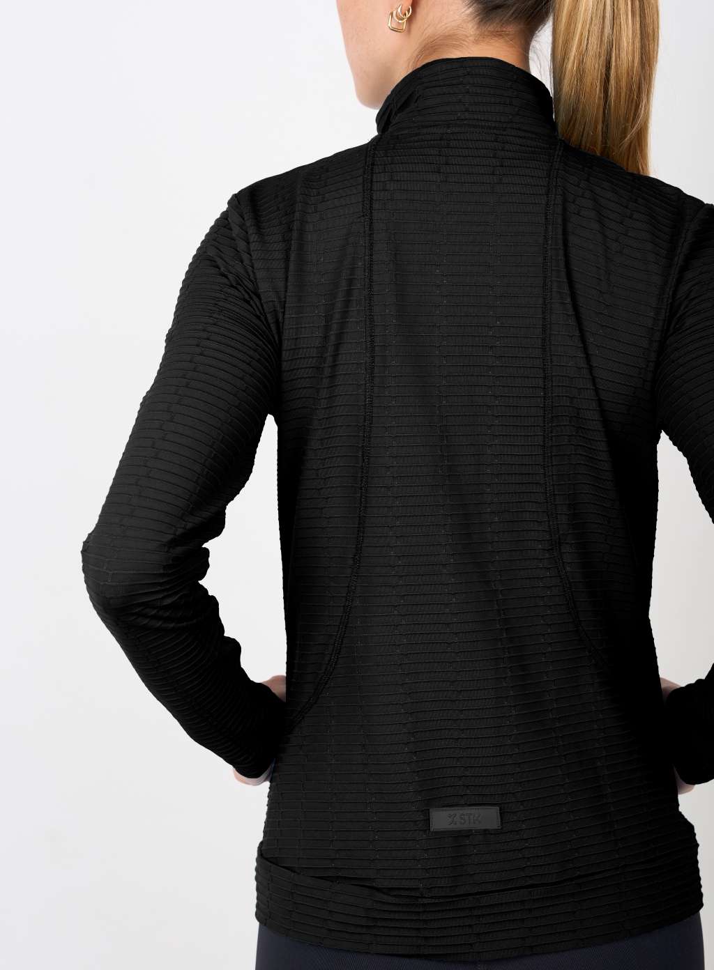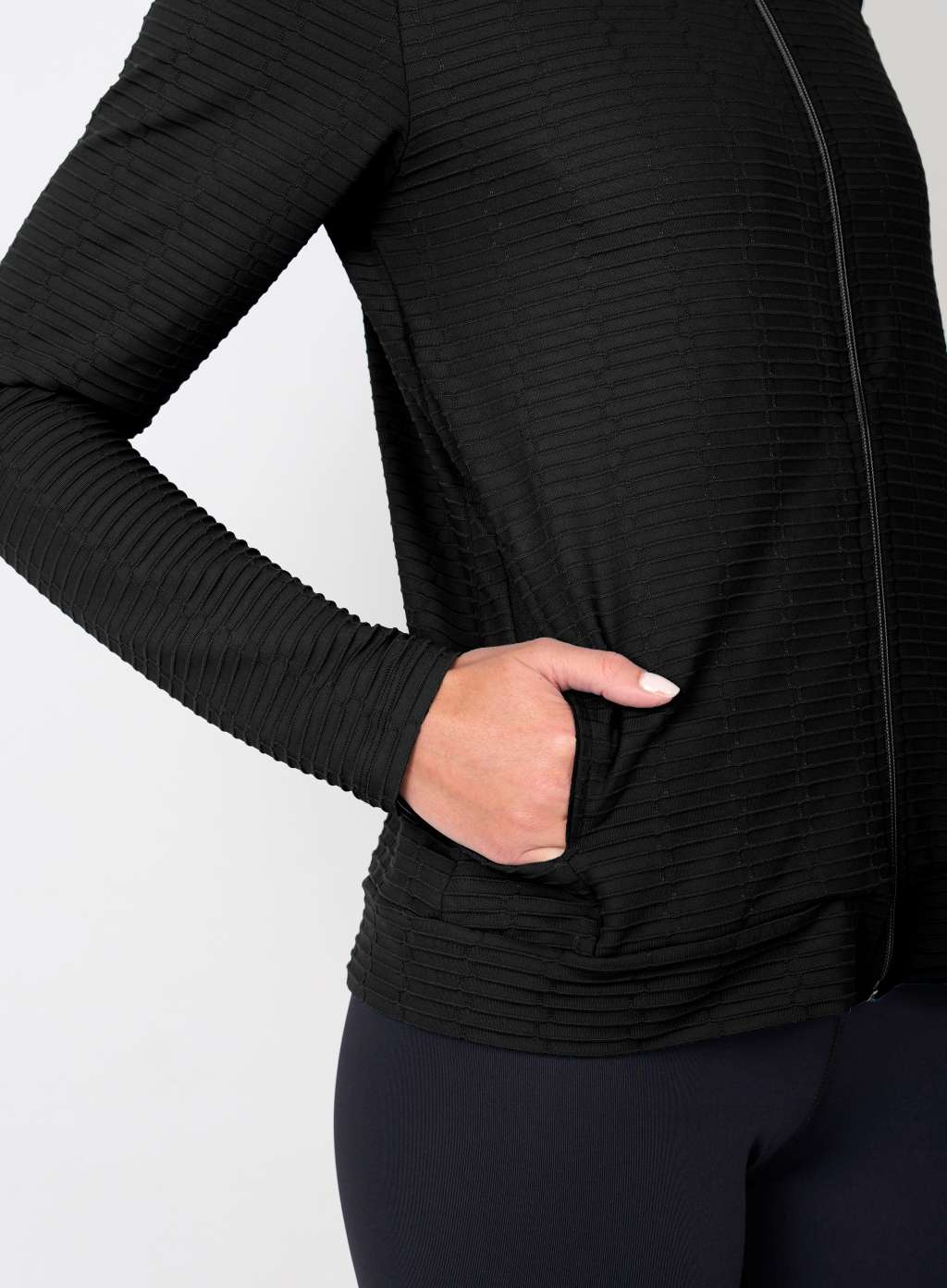 Confeccionada en tejido Olinda, textura con elastano y poliamida de gran elasticidad y durabilidad. Estructura de doble rebote y acabado ReCicle+; biodegradable, fabricado con silicona reciclada. Diseño con cuello alto, bolsillos en los laterales del delantero y espalda con recorte en costuras bordador.